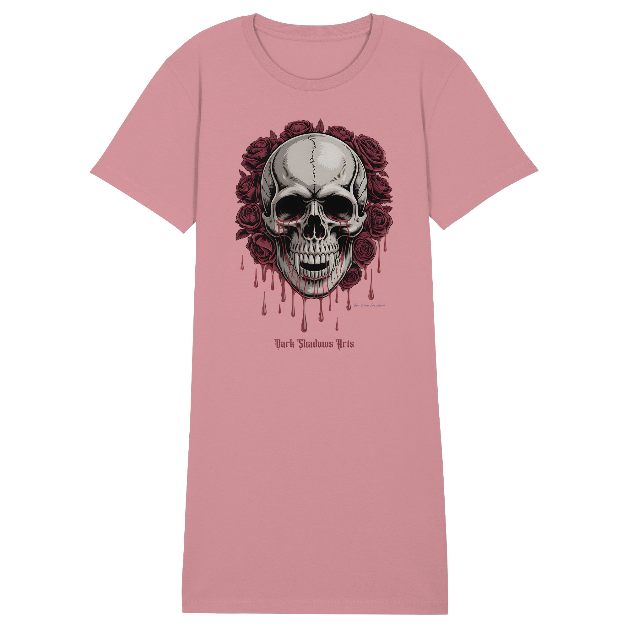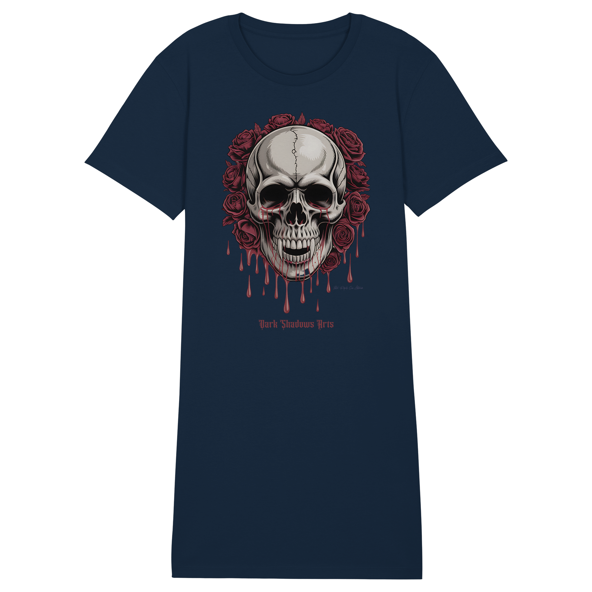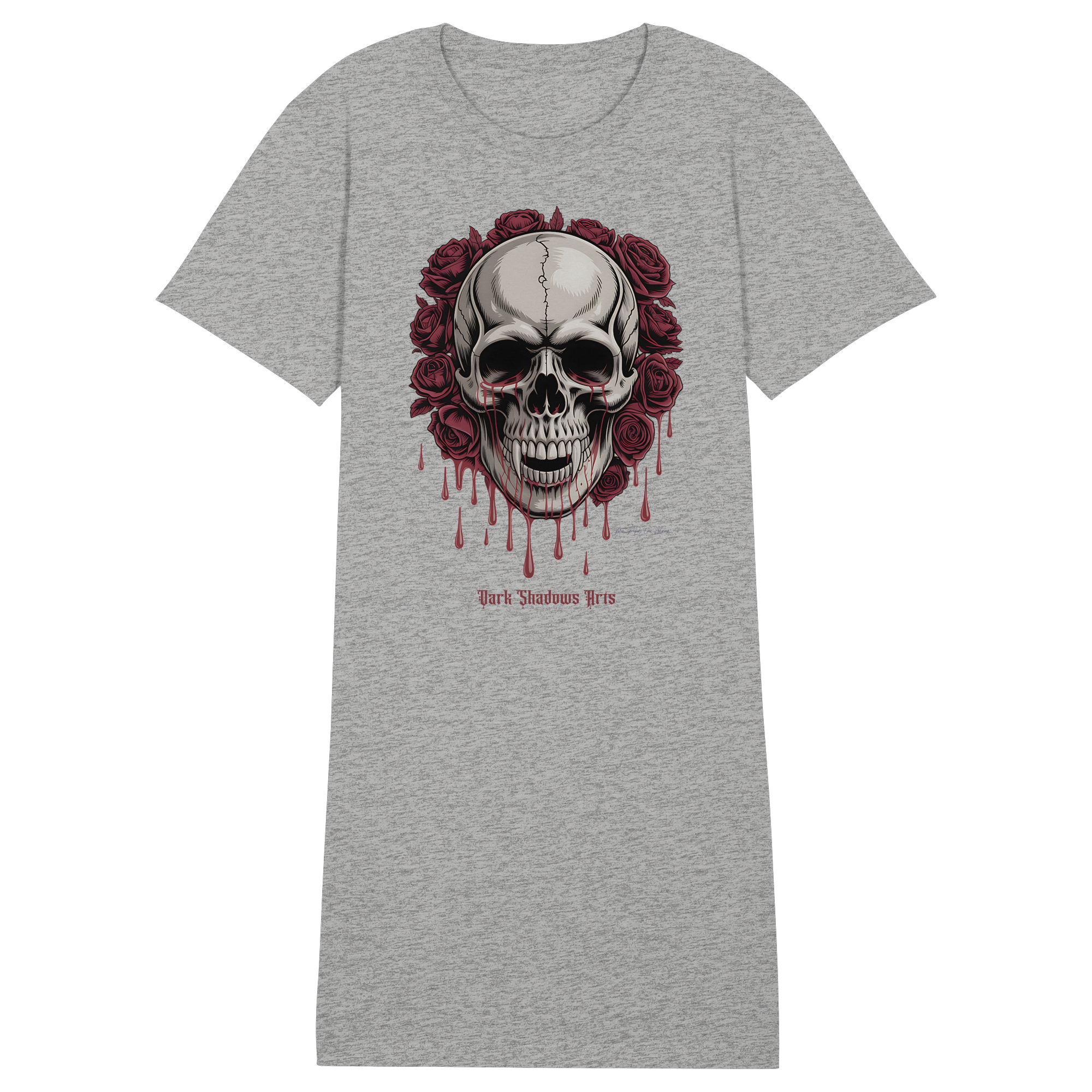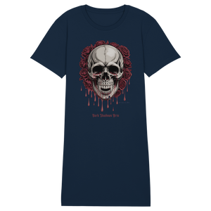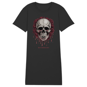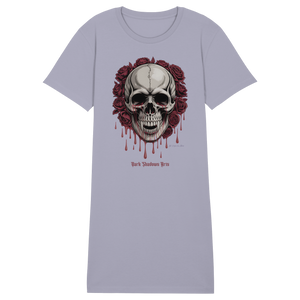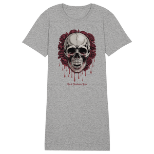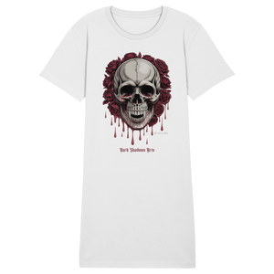 Das Blood Roses Organic Shirt Dress vereint düsteren Gothic-Style mit nachhaltiger Mode. Der markante Vampir-Schädel, umrahmt von blutroten Rosen, setzt ein starkes Statement – egal ob du es als Kleid oder als Longshirt trägst.